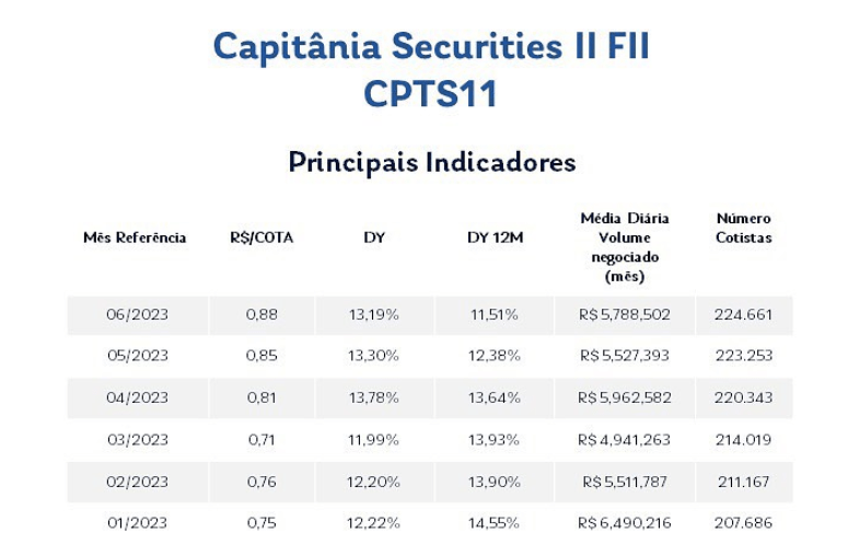 O FII Capitânia Securities II (CPTS11) comunicou ao mercado que pagará, na próxima quarta-feira (19), dividendos de R$ 0,88 por cota. O montante – cujo mês de referência é junho – equivale a uma taxa de retorno (dividend yield) mensal de 1%.